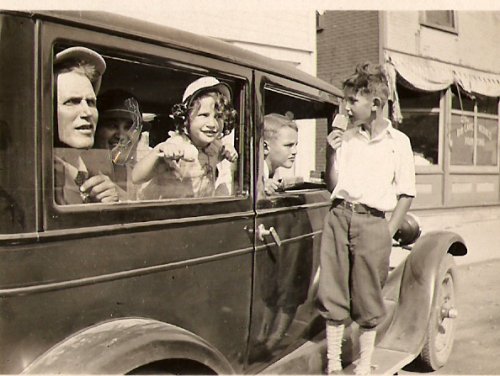 This picture is of Peter and his young family during a trip. I need to validate where and when it took place. I assume it was taken in the 1920s. Peter is on the far left sticking his head out. Next is Wife Vera, daughter Phyllis, and son Allan. The boy on the outside is son Richard.