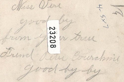 It reads: Miss Vera, Good by from your true friend Peter Courchine. Good by by.