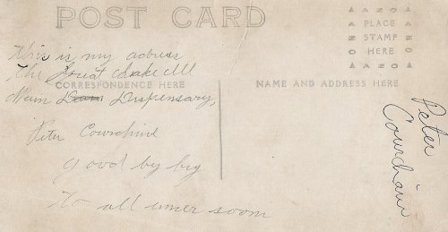 This picture was made into a post card and has writing by Peter on it . See below. Peter joined the navy during World War I.
